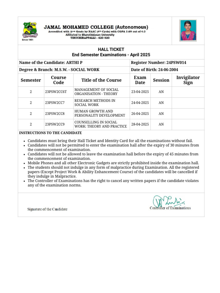 Name of the Candidate: ARTHI P Register Number: 24PSW014