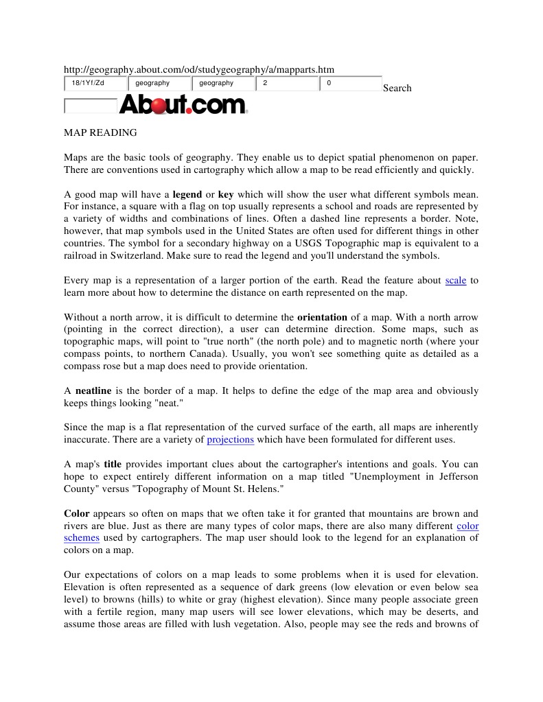 MAP READING Maps are the basic tools of geography. They enable us to depict spatial phenomenon on paper. There are conventions used in cartography which allow a map to be read efficiently and quickly. A good map will have a legend or key which will show the user what different symbols mean. For instance, a square with a flag on top usually represents a school and roads are represented by a variety of widths and combinations of lines. Often a dashed line represents a border. Note, however, that map symbols used in the United States are often used for different things in other countries. The symbol for a secondary highway on a USGS Topographic map is equivalent to a railroad in Switzerland. Make sure to read the legend and you'll understand the symbols. Every map is a representation of a larger portion of the earth. Read the feature about scale to learn more about how to determine the distance on earth represented on the map. Without a north arrow, it is difficult to determine the orientation of a map. With a north arrow (pointing in the correct direction), a user can determine direction. Some maps, such as topographic maps, will point to "true north" (the north pole) and to magnetic north (where your compass points, to northern Canada). Usually, you won't see something quite as detailed as a compass rose but a map does need to provide orientation. A neatline is the border of a map. It helps to define the edge of the map area and obviously keeps things looking "neat." Since the map is a flat representation of the curved surface of the earth, all maps are inherently inaccurate. There are a variety of projections which have been formulated for different uses. A map's title provides important clues about the cartographer's intentions and goals. You can hope to expect entirely different information on a map titled "Unemployment in Jefferson County" versus "Topography of Mount St. Helens." Color appears so often on maps that we often take it for granted that mountains are brown and rivers are blue. Just as there are many types of color maps, there are also many different color schemes used by cartographers. The map user should look to the legend for an explanation of colors on a map. Our expectations of colors on a map leads to some problems when it is used for elevation. Elevation is often represented as a sequence of dark greens (low elevation or even below sea level) to browns (hills) to white or gray (highest elevation). Since many people associate green with a fertile region, many map users will see lower elevations, which may be deserts, and assume those areas are filled with lush vegetation. Also, people may see the reds and browns of