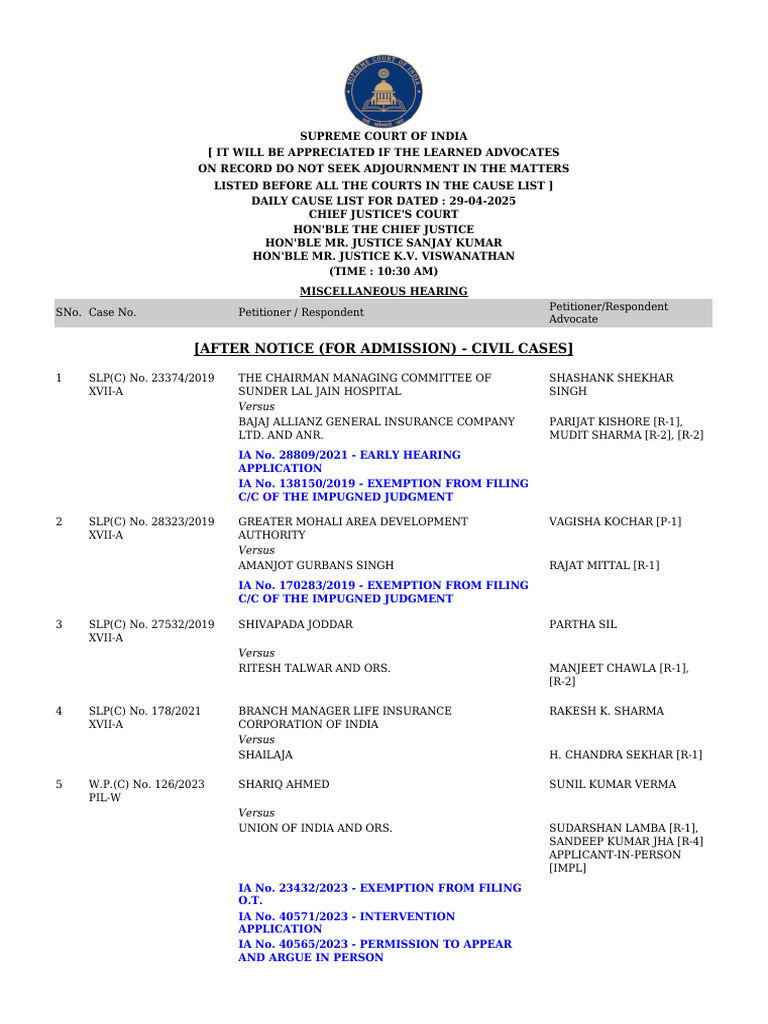 DAILY CAUSE LIST FOR DATED : 29-04-2025