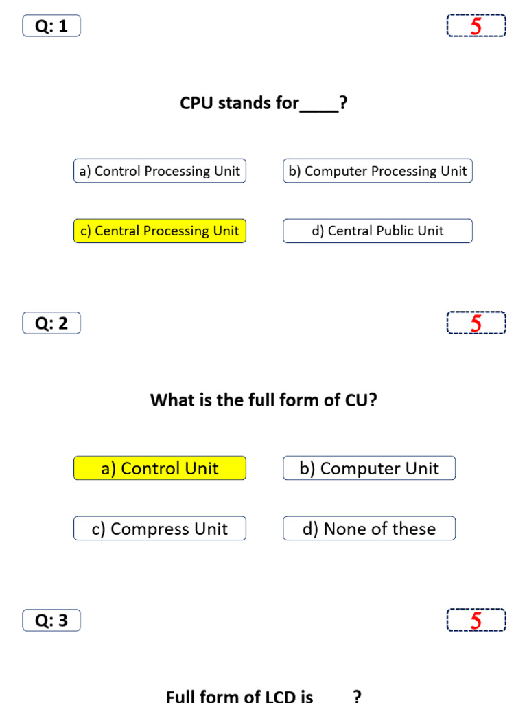 The document consists of a series of multiple-choice questions related to computer terminology and acronyms. Each question asks for the full form of various technical terms such as CPU, RAM, and USB, providing four options for each. This format is designed to test knowledge in computer science and technology.