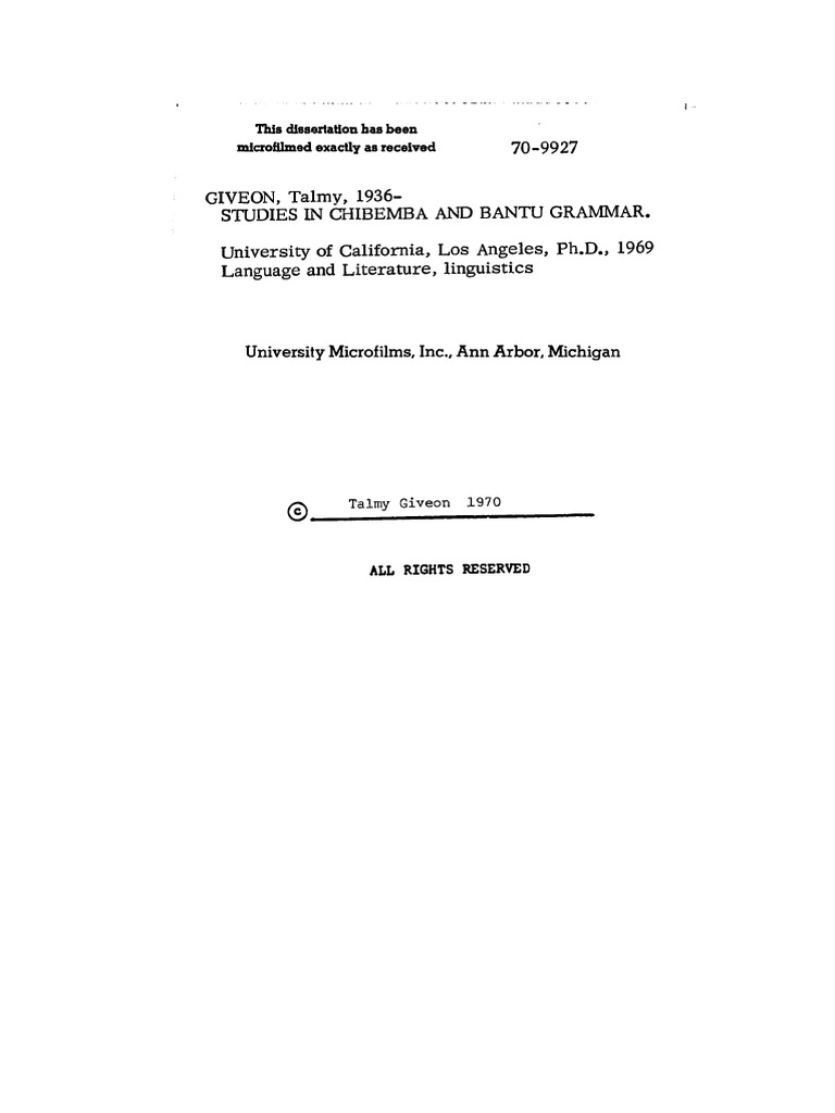 STUDIES IN CHIBEMBA AND BANTU GRAMMAR