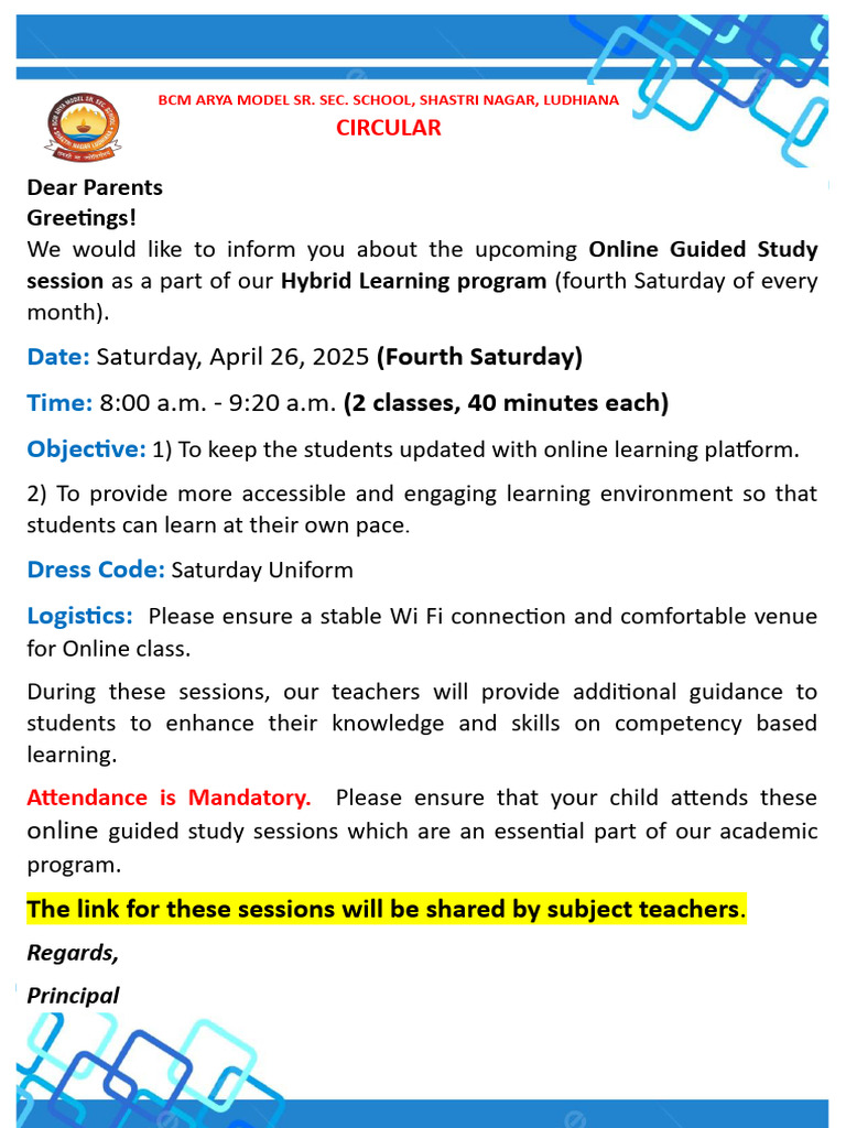 The link for these sessions will be shared by subject teachers.