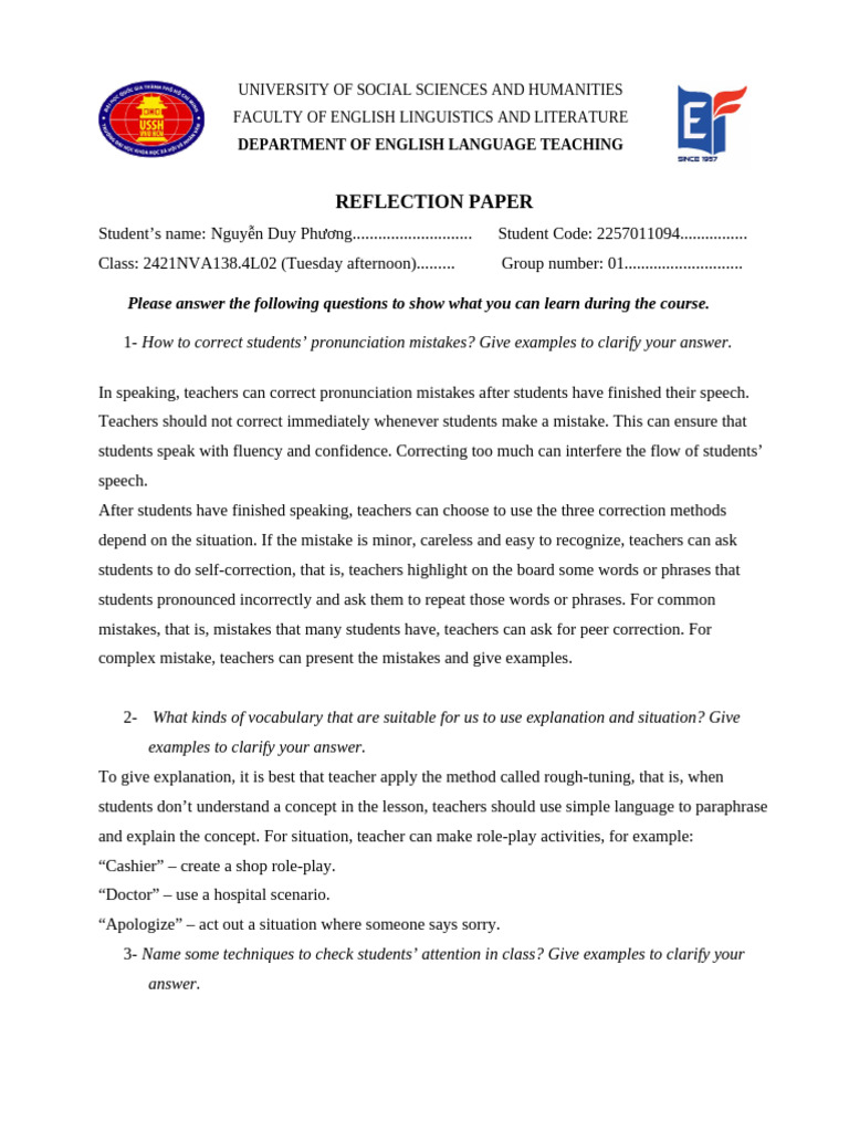 Student’s name: Nguyễn Duy Phương............................ Student Code: 2257011094................