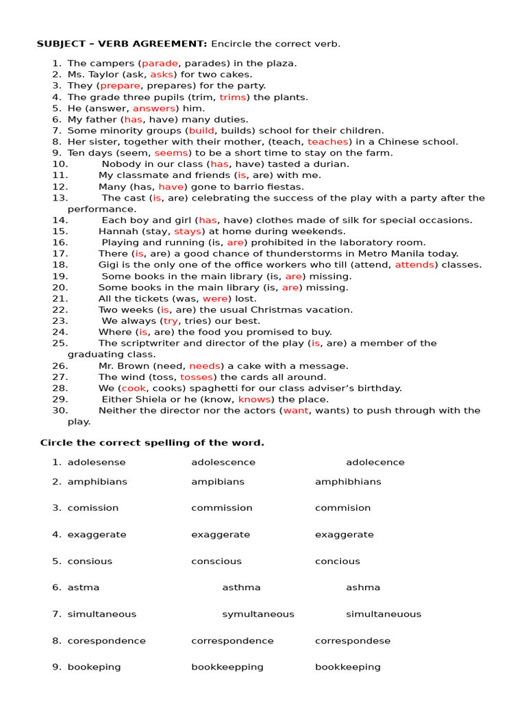 SUBJECT – VERB AGREEMENT: Encircle the correct verb.
