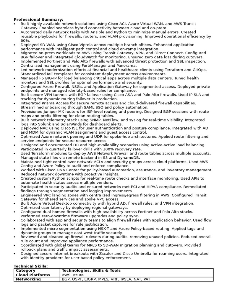 SolarWinds, BGP, VPN, VRF, VLAN, Ansible, Python, Panorama, IAM, Security Groups, ACLs, NAT, DNS,