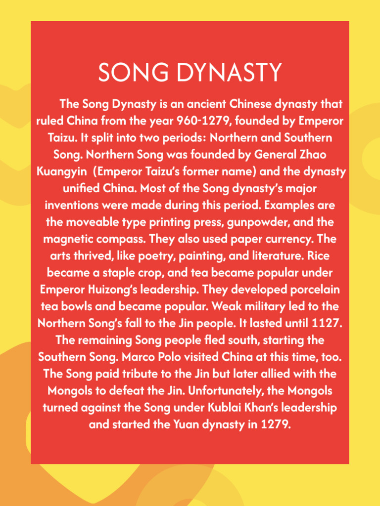 Dynasty. moveable type printing gunpowder. magnetic compass. control of its northern