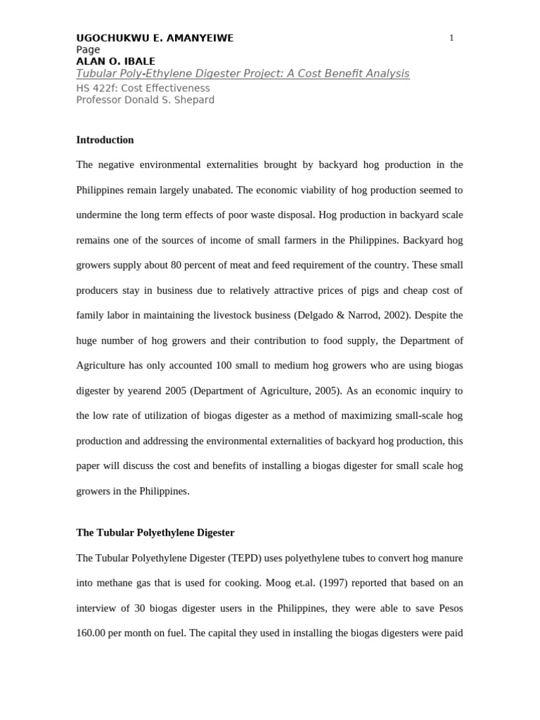 paper will discuss the cost and benefits of installing a biogas digester for small scale hog