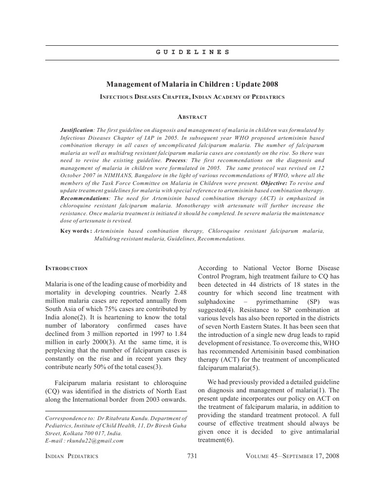 Justification: The first guideline on diagnosis and management of malaria in children was formulated by Infectious Diseases Chapter of IAP in 2005. In subsequent year WHO proposed artemisinin based combination therapy in all cases of uncomplicated falciparum malaria. The number of falciparum malaria as well as multidrug resistant falciparum malaria cases are constantly on the rise. So there was need to revise the existing guideline. Process: The first recommendations on the diagnosis and management of malaria in children were formulated in 2005. The same protocol was revised on 12 October 2007 in NIMHANS, Bangalore in the light of various recommendations of WHO, where all the members of the Task Force Committee on Malaria in Children were present. Objective: To revise and update treatment guidelines for malaria with special reference to artemisinin based combination therapy. Recommendations: The need for Artemisinin based combination therapy (ACT) is emphasized in chloroquine resistant falciparum malaria. Monotherapy with artesunate will further increase the resistance. Once malaria treatment is initiated it should be completed. In severe malaria the maintenance dose of artesunate is revised. Key words : Artemisinin based combination therapy, Chloroquine resistant falciparum malaria, Multidrug resistant malaria, Guidelines, Recommendations.