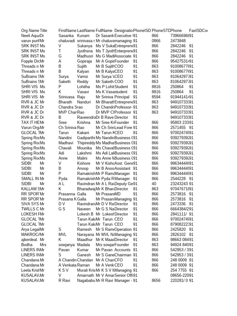 Org Name Title FirstName LastName FullName DesignatioPhoneISD PhoneSTDPhone FaxISDCod