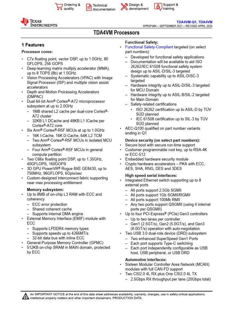 • C7x floating point, vector DSP, up to 1.0GHz, 80 – Developed for functional safety applications