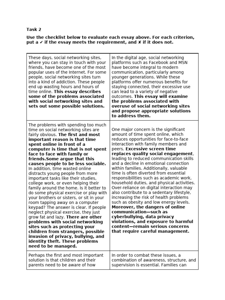 put a ✔ if the essay meets the requirement, and ✘ if it does not.