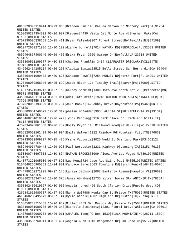 4190024245611100|05/29|949|Gian|2867 Eastbrook Dr APT 1|Columbus|Nebraska (NE)|