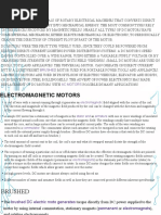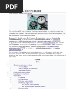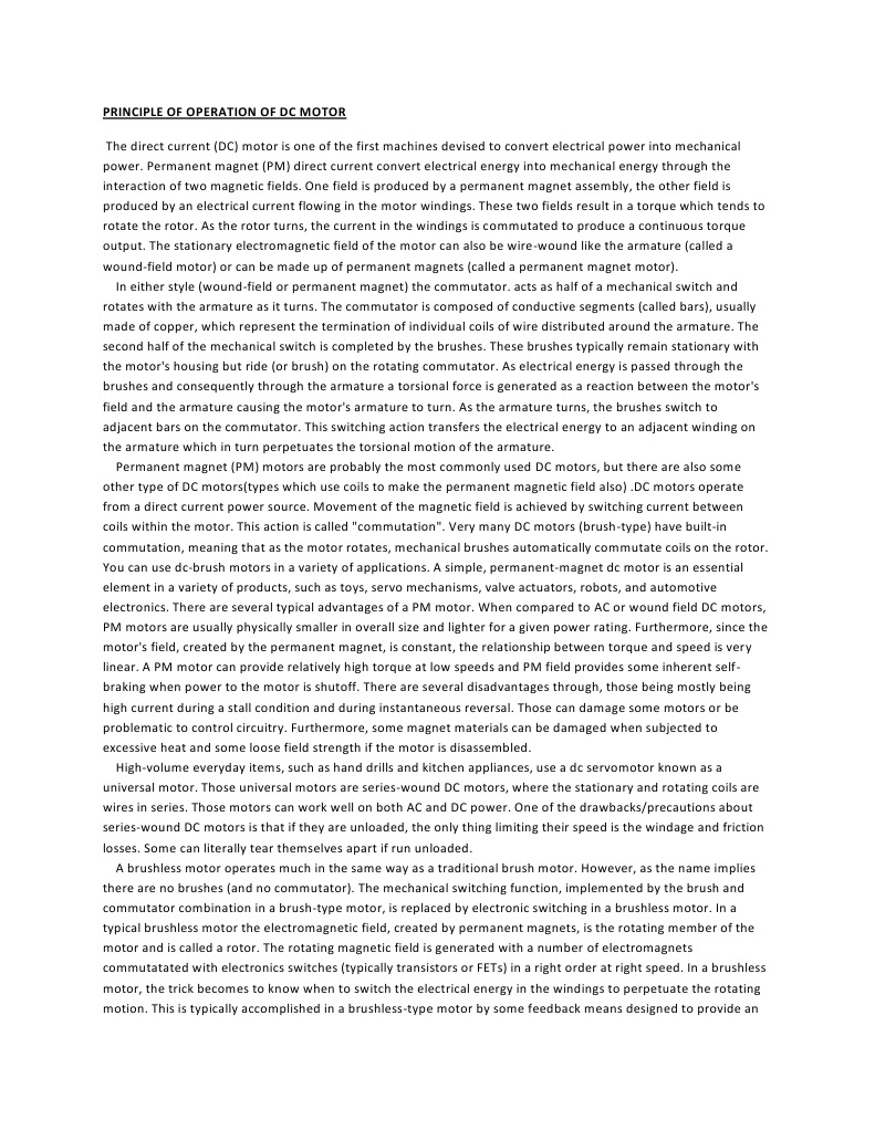 power into mechanical power. Permanent magnet (PM) direct current convert electrical energy into mechanical energy through the interaction of two magnetic fields. One field is produced by a permanent magnet assembly, the other field is produced by an electrical current flowing in the motor windings. These two fields result in a torque which tends to rotate the rotor. As the rotor turns, the current in the windings is commutated to produce a continuous torque output. The stationary electromagnetic field of the motor can also be wire-wound like the armature (called a wound-field motor) or can be made up of permanent magnets (called a permanent magnet motor). In either style (wound-field or permanent magnet) the commutator. acts as half of a mechanical switch and rotates with the armature as it turns. The commutator is composed of conductive segments (called bars), usually made of copper, which represent the termination of individual coils of wire distributed around the armature. The second half of the mechanical switch is completed by the brushes. These brushes typically remain stationary with the motor's housing but ride (or brush) on the rotating commutator. As electrical energy is passed through the brushes and consequently through the armature a torsional force is generated as a reaction between the motor's field and the armature causing the motor's armature to turn. As the armature turns, the brushes switch to adjacent bars on the commutator. This switching action transfers the electrical energy to an adjacent winding on the armature which in turn perpetuates the torsional motion of the armature. Permanent magnet (PM) motors are probably the most commonly used DC motors, but there are also some other type of DC motors(types which use coils to make the permanent magnetic field also) .DC motors operate from a direct current power source. Movement of the magnetic field is achieved by switching current between coils within the motor. This action is called "commutation". Very many DC motors (brush-type) have built-in commutation, meaning that as the motor rotates, mechanical brushes automatically commutate coils on the rotor. You can use dc-brush motors in a variety of applications. A simple, permanent-magnet dc motor is an essential element in a variety of products, such as toys, servo mechanisms, valve actuators, robots, and automotive electronics. There are several typical advantages of a PM motor. When compared to AC or wound field DC motors, PM motors are usually physically smaller in overall size and lighter for a given power rating. Furthermore, since the motor's field, created by the permanent magnet, is constant, the relationship between torque and speed is very linear. A PM motor can provide relatively high torque at low speeds and PM field provides some inherent selfbraking when power to the motor is shutoff. There are several disadvantages through, those being mostly being high current during a stall condition and during instantaneous reversal. Those can damage some motors or be problematic to control circuitry. Furthermore, some magnet materials can be damaged when subjected to excessive heat and some loose field strength if the motor is disassembled. High-volume everyday items, such as hand drills and kitchen appliances, use a dc servomotor known as a universal motor. Those universal motors are series-wound DC motors, where the stationary and rotating coils are wires in series. Those motors can work well on both AC and DC power. One of the drawbacks/precautions about series-wound DC motors is that if they are unloaded, the only thing limiting their speed is the windage and friction losses. Some can literally tear themselves apart if run unloaded. A brushless motor operates much in the same way as a traditional brush motor. However, as the name implies there are no brushes (and no commutator). The mechanical switching function, implemented by the brush and commutator combination in a brush-type motor, is replaced by electronic switching in a brushless motor. In a typical brushless motor the electromagnetic field, created by permanent magnets, is the rotating member of the motor and is called a rotor. The rotating magnetic field is generated with a number of electromagnets commutatated with electronics switches (typically transistors or FETs) in a right order at right speed. In a brushless motor, the trick becomes to know when to switch the electrical energy in the windings to perpetuate the rotating motion. This is typically accomplished in a brushless-type motor by some feedback means designed to provide an