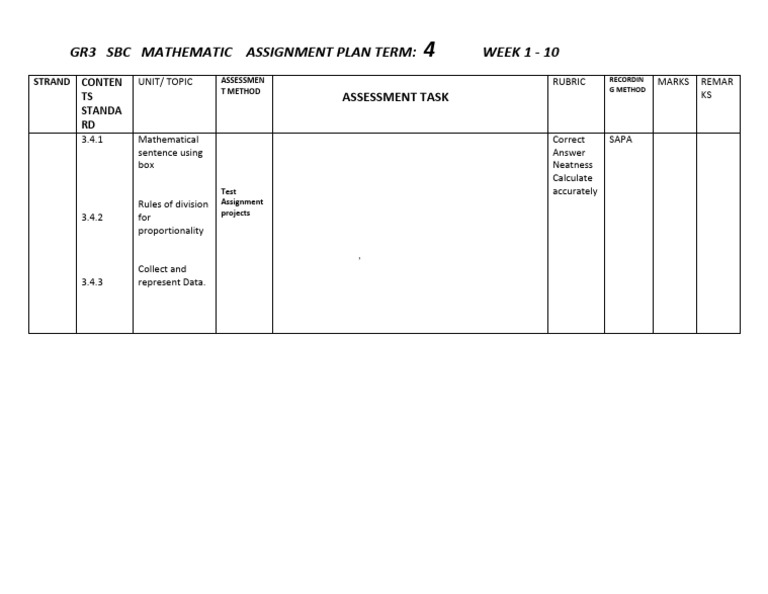 GR3 SBC MATHEMATIC ASSIGNMENT PLAN TERM: 4 WEEK 1 - 10