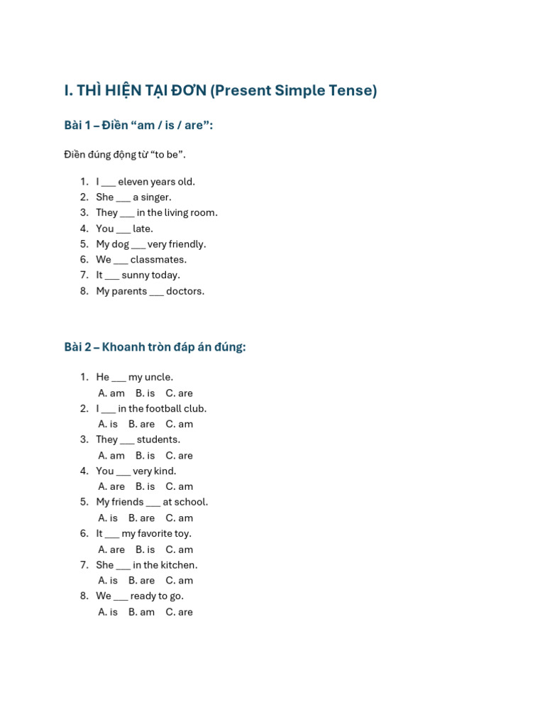 Bài 1 – Điền “am / is / are”: