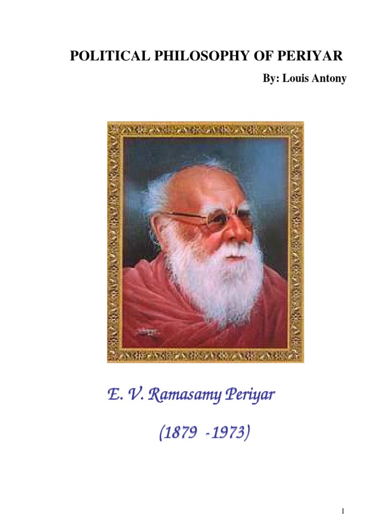 In this dissertation, I make an attempt to understand Periyar, his philosophy and his values. In the introductory chapter, I deal with the early life of Periyar, the South Indian situation during his time and the socio-political role of young E. V. R. Periyar. The second chapter deals with Periyars powerful philosophythe Self-Respect Movement. In this chapter, I have dealt with its origin, philosophy, meaning, politics, gains, etc. An attempt is also made to show the birth and present situation of Dravida Kazhagam. In the third chapter, I have elaborated Periyars views on womens rights. The fourth chapter portrays Periyars views on religion. The final chapter deals with the present political situation of India, particularly in Tamil Nadu. I have also made an effort to analyze the question, whether Periyar is a failure or an ideal for the present day.