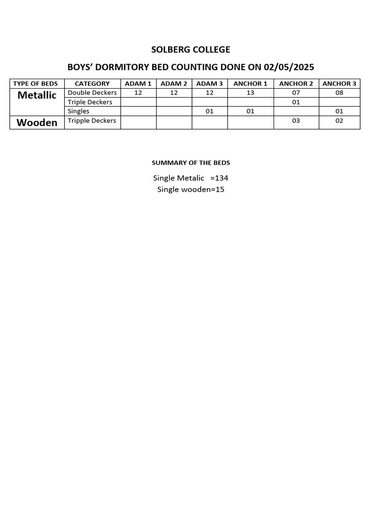 BOYS’ DORMITORY BED COUNTING DONE ON 02/05/2025
