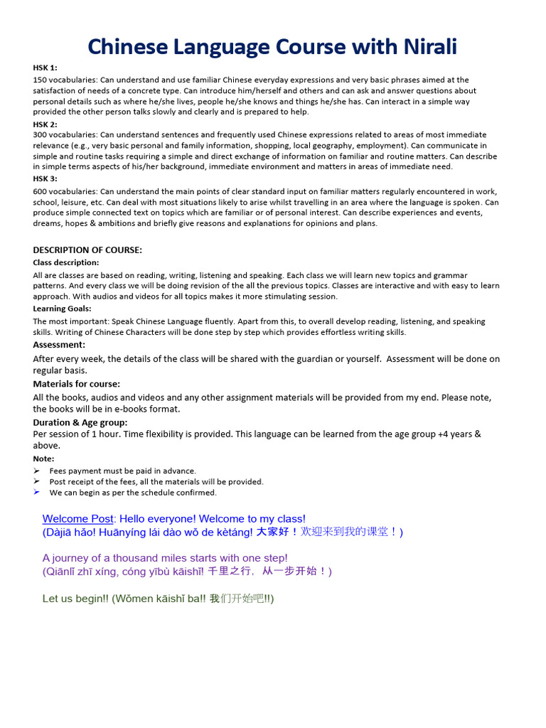 Per session of 1 hour. Time flexibility is provided. This language can be learned from the age group +4 years &