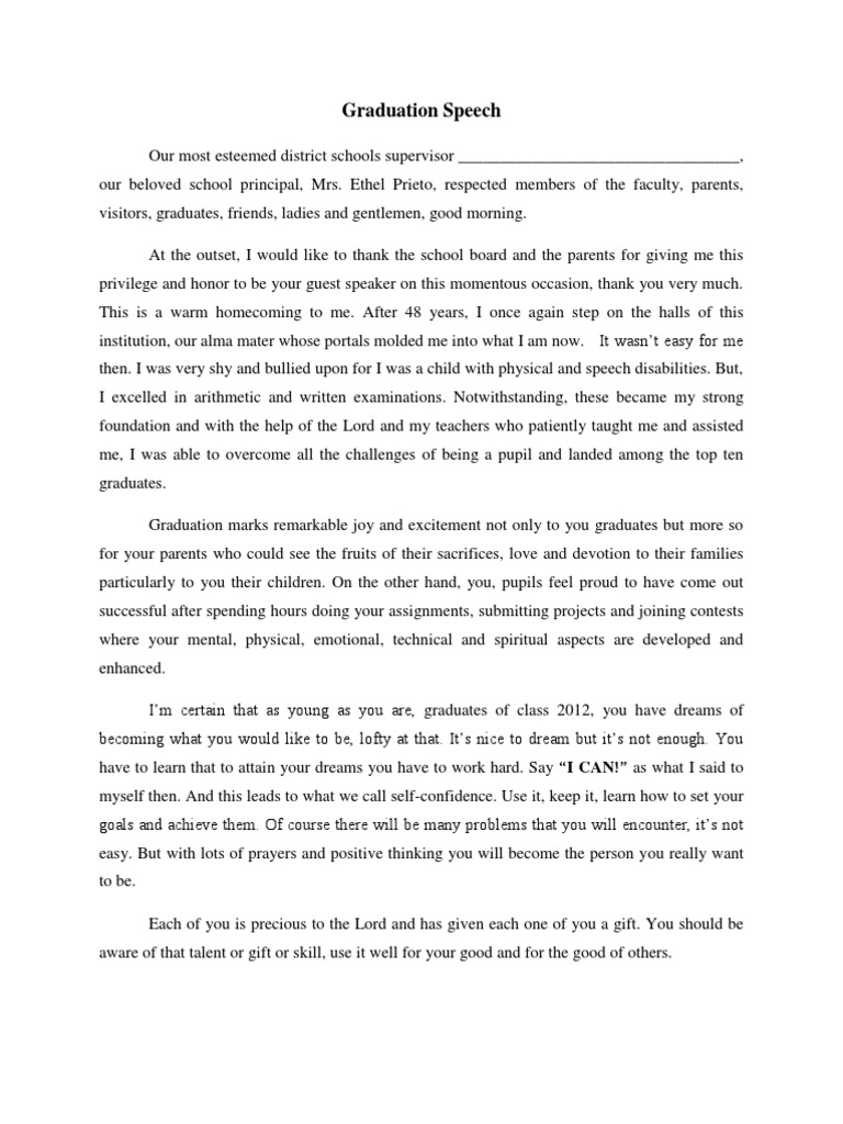 Our most esteemed district schools supervisor __________________________________, our beloved school principal, Mrs. Ethel Prieto, respected members of the faculty, parents, visitors, graduates, friends, ladies and gentlemen, good morning. At the outset, I would like to thank the school board and the parents for giving me this privilege and honor to be your guest speaker on this momentous occasion, thank you very much. This is a warm homecoming to me. After 48 years, I once again step on the halls of this institution, our alma mater whose portals molded me into what I am now. It wasnt easy for me then. I was very shy and bullied upon for I was a child with physical and speech disabilities. But, I excelled in arithmetic and written examinations. Notwithstanding, these became my strong foundation and with the help of the Lord and my teachers who patiently taught me and assisted me, I was able to overcome all the challenges of being a pupil and landed among the top ten graduates. Graduation marks remarkable joy and excitement not only to you graduates but more so for your parents who could see the fruits of their sacrifices, love and devotion to their families particularly to you their children. On the other hand, you, pupils feel proud to have come out successful after spending hours doing your assignments, submitting projects and joining contests where your mental, physical, emotional, technical and spiritual aspects are developed and enhanced. Im certain that as young as you are, graduates of class 2012, you have dreams of becoming what you would like to be, lofty at that. Its nice to dream but its not enough. You have to learn that to attain your dreams you have to work hard. Say I CAN! as what I said to myself then. And this leads to what we call self-confidence. Use it, keep it, learn how to set your goals and achieve them. Of course there will be many problems that you will encounter, its not easy. But with lots of prayers and positive thinking you will become the person you really want to be. Each of you is precious to the Lord and has given each one of you a gift. You should be aware of that talent or gift or skill, use it well for your good and for the good of others.