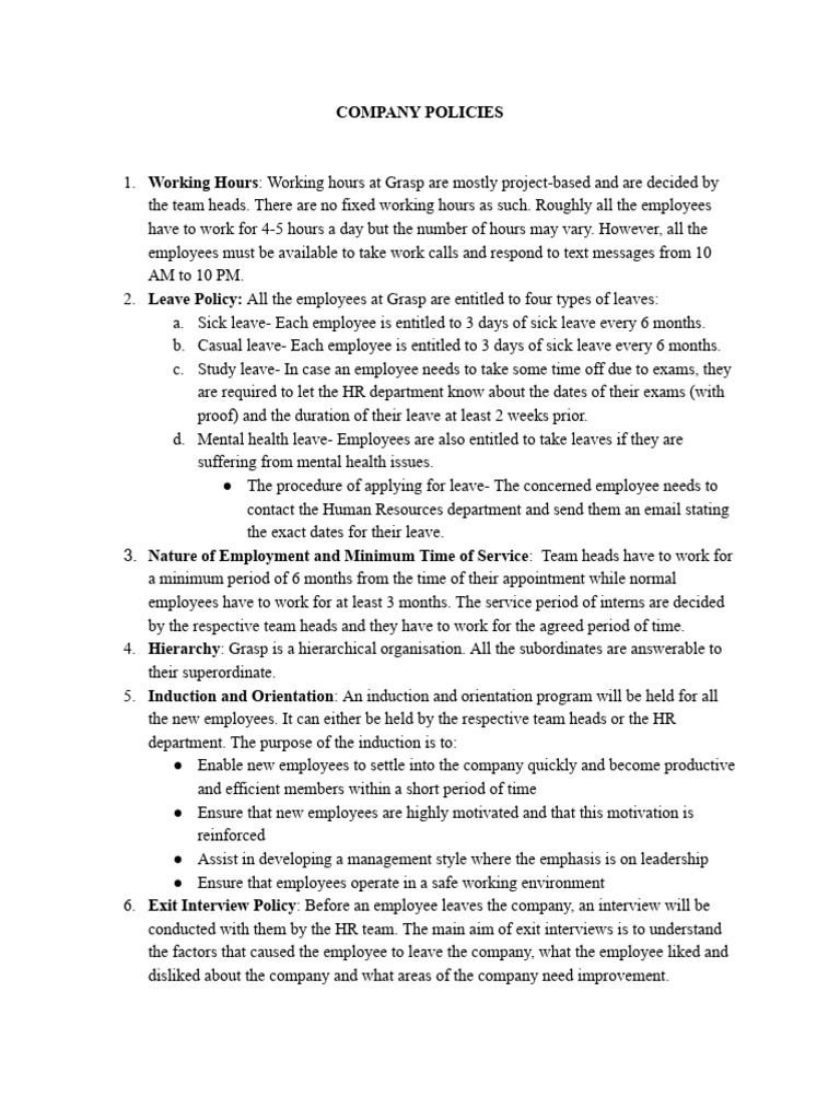 2. Leave Policy: All the employees at Grasp are entitled to four types of leaves: