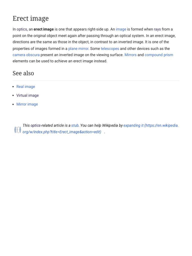 In optics, an erect image is one that appears right-side up. An image is formed when rays from a