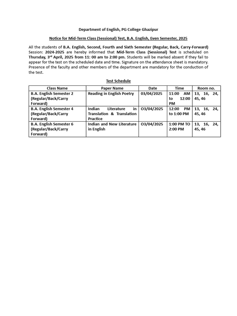 Notice for Mid-Term Class (Sessional) Test, B.A. English, Even Semester, 2025