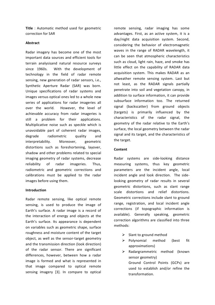 Title : Automatic method used for geometric correction for SAR Abstract Radar imagery has become one
