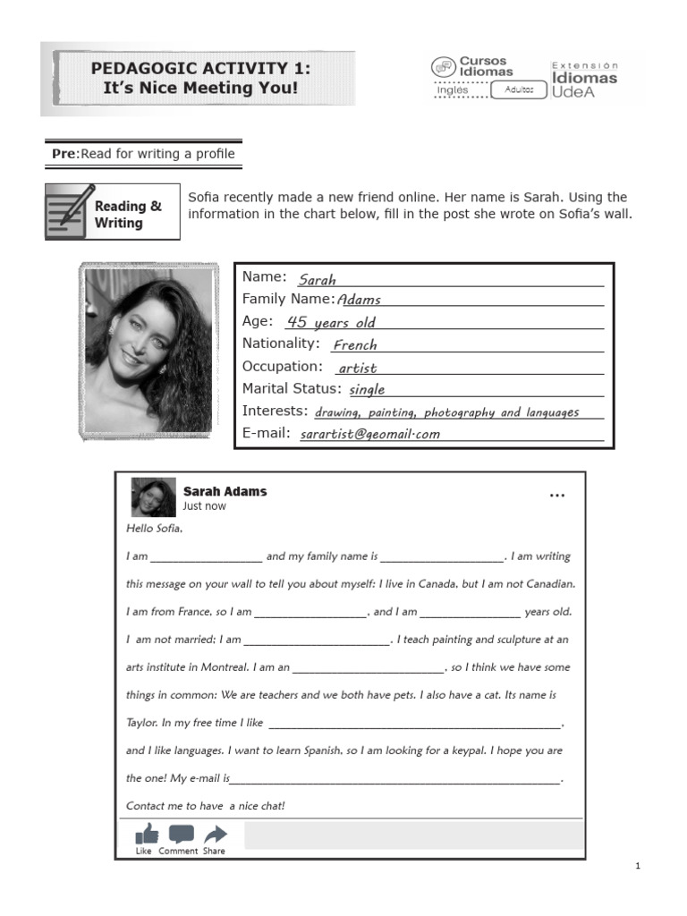information in the chart below, fill in the post she wrote on Sofia’s wall.