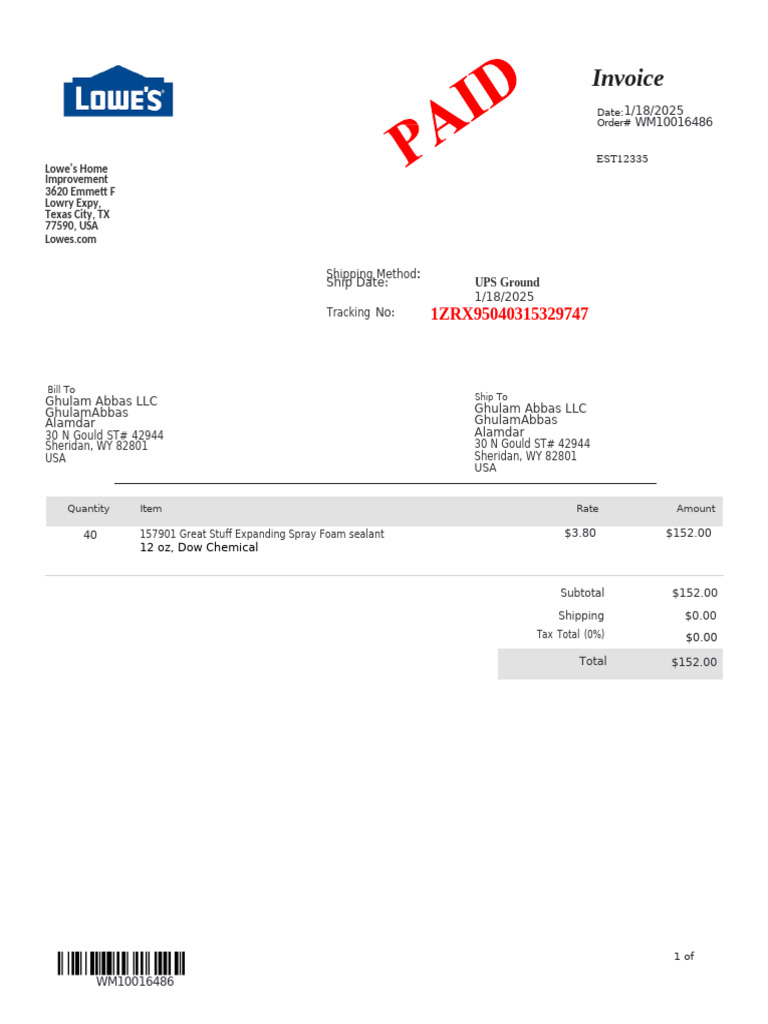 Tracking No: 1ZRX95040315329747