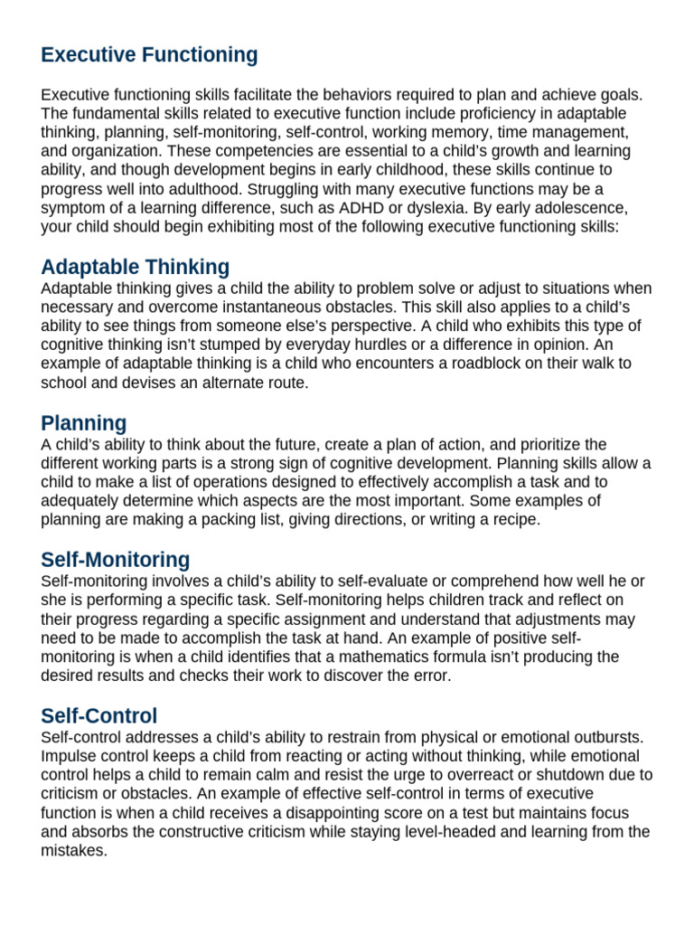 your child should begin exhibiting most of the following executive functioning skills: