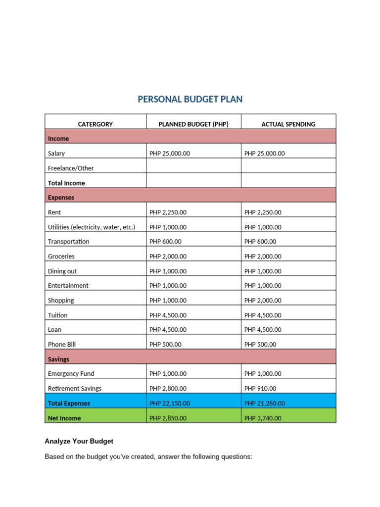 PERSONAL BUDGET PLAN