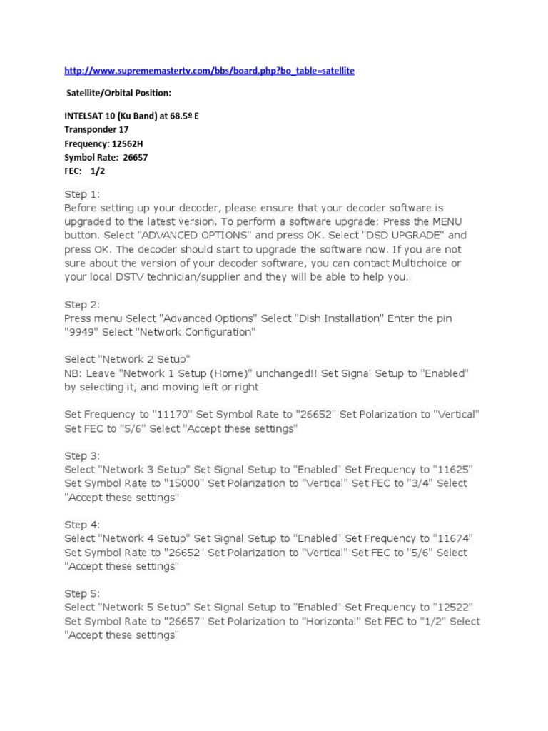 5 E Transponder 17 Frequency: 12562H Symbol Rate: 26657 FEC: 1/2 Step 1: Before setting up your decoder, please ensure that your decoder software is upgraded to the latest version. To perform a software upgrade: Press the MENU button. Select "ADVANCED OPTIONS" and press OK. Select "DSD UPGRADE" and press OK. The decoder should start to upgrade the software now. If you are not sure about the version of your decoder software, you can contact Multichoice or your local DSTV technician/supplier and they will be able to help you. Step 2: Press menu Select "Advanced Options" Select "Dish Installation" Enter the pin "9949" Select "Network Configuration" Select "Network 2 Setup" NB: Leave "Network 1 Setup (Home)" unchanged!! Set Signal Setup to "Enabled" by selecting it, and moving left or right Set Frequency to "11170" Set Symbol Rate to "26652" Set Polarization to "Vertical" Set FEC to "5/6" Select "Accept these settings" Step 3: Select "Network 3 Setup" Set Signal Setup to "Enabled" Set Frequency to "11625" Set Symbol Rate to "15000" Set Polarization to "Vertical" Set FEC to "3/4" Select "Accept these settings" Step 4: Select "Network 4 Setup" Set Signal Setup to "Enabled" Set Frequency to "11674" Set Symbol Rate to "26652" Set Polarization to "Vertical" Set FEC to "5/6" Select "Accept these settings" Step 5: Select "Network 5 Setup" Set Signal Setup to "Enabled" Set Frequency to "12522" Set Symbol Rate to "26657" Set Polarization to "Horizontal" Set FEC to "1/2" Select "Accept these settings"