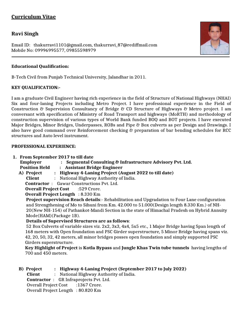 I am a graduate Civil Engineer having rich experience in the field of Structure of National Highways (NHAI)