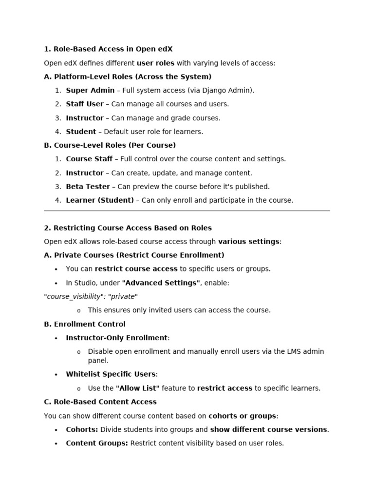 Open edX allows role-based course access through various settings: