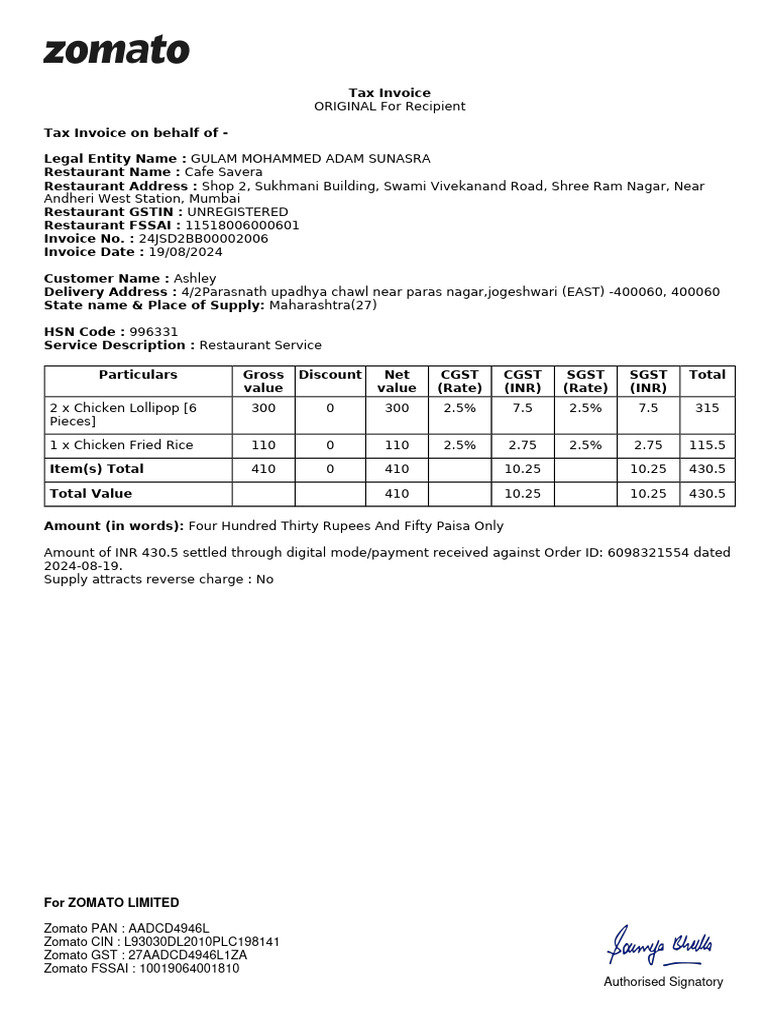 Email ID: order@zomato.com GSTIN: 27AADCD4946L1ZA