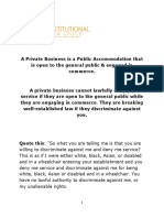 Introduction Basic right of property owner is to control resources they own key to this is the right to exclude non-owners from their property This right is not absolute Law presumes that possessors have rights of owners (simpler) Often thought of as most treasured in owners bundle of rights Protects interests in exclusive possession and quiet enjoyment Human values, social efficiency Exclusionary power limited by others rights of access Possession is about exclusion and use ii. Excluding/Admitting People 1. Private Property (closed to the public) W/ exception, owners/possessors of private property have legal right to exclude others from that property License: permission to enter property possessed by another; generally revocable at will. Trespass: unprivileged physical invasion of property possessed by another Intent: as long as voluntary act Intrusion: occurs at moment nonowner enters the property (person or object) Remedies: Damages 1. Nominal: no proof of harm required 2. Compensatory: if caused harm to the property 3. Punitive: punish/deter outrageous/malicious behavior 4. Permanent: if permanent damage diminution value Injunction ordering wrongdoer to cease conduct Ejectment: remove trespasser from land Declaratory Judgment stating legal rights against other party (State v. Shack) Trespass is also a criminal wrong 2. Shared Use or Possession When an owner has allowed others to enter her property/agreed to transfer possession to another, special rules may apply 3. Public Accommodations (open to public) Places that are open to the public and hold themselves out as ready to serve members of the public for specific purposes Duty to serve has historically always been placed on common carriers and inns Many state and federal statutes have expanded to include virtually any facility that is open to, and offers goods or services to, the public Retail Stores: Statutes dont actually say have the right to discriminate, they just failed to regulate against it.