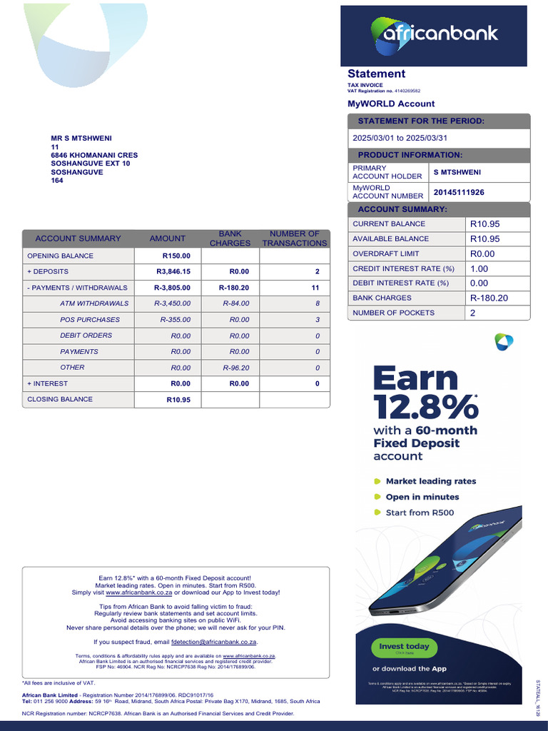 NCR Registration number: NCRCP7638. African Bank is an Authorised Financial Services and Credit Provider.
