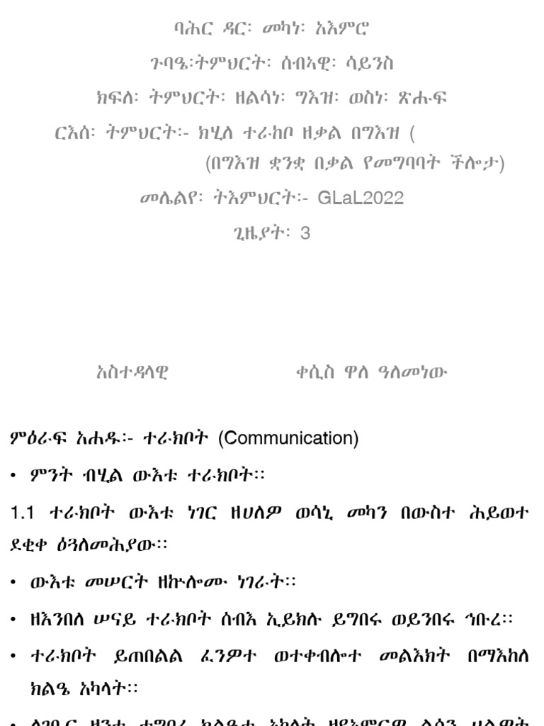 ርእሰ፡ ትምህርት፡- ክሂሇ ተራከቦ ዖቃሌ በግእዝ (Geez Oral
