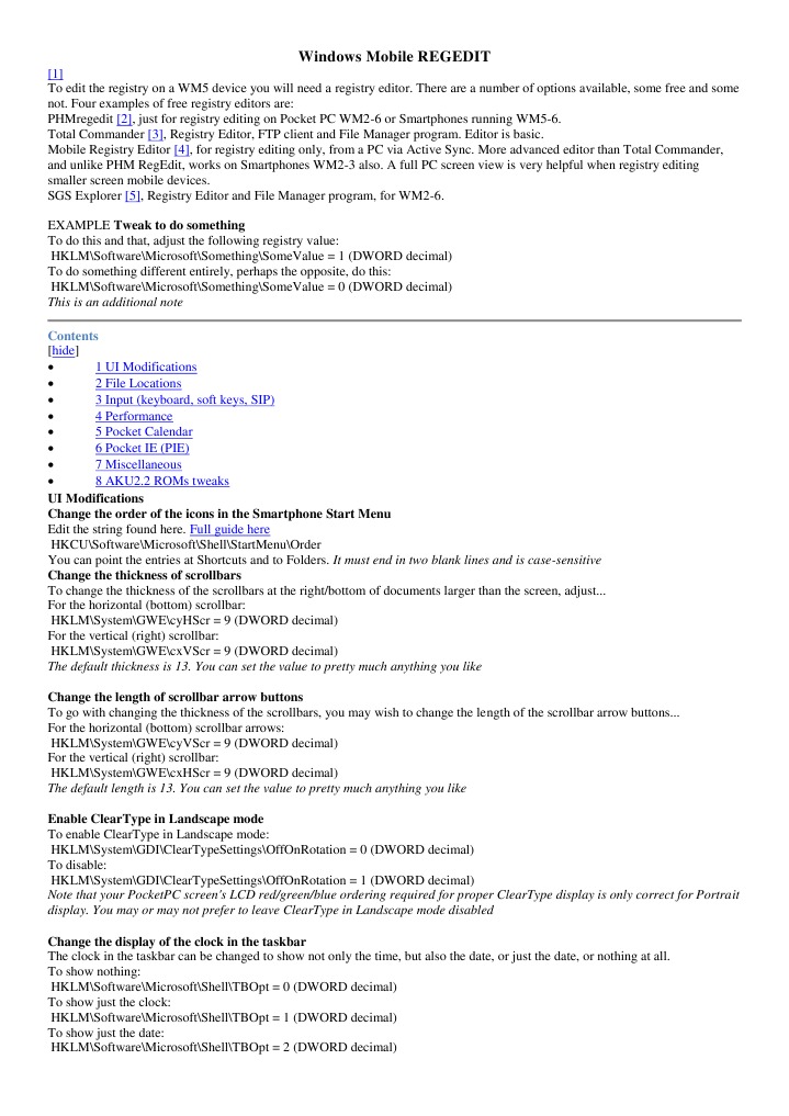[1] To edit the registry on a WM5 device you will need a registry editor. There are a number of options available, some free and some not. Four examples of free registry editors are: PHMregedit [2], just for registry editing on Pocket PC WM2-6 or Smartphones running WM5-6. Total Commander [3], Registry Editor, FTP client and File Manager program. Editor is basic. Mobile Registry Editor [4], for registry editing only, from a PC via Active Sync. More advanced editor than Total Commander, and unlike PHM RegEdit, works on Smartphones WM2-3 also. A full PC screen view is very helpful when registry editing smaller screen mobile devices. SGS Explorer [5], Registry Editor and File Manager program, for WM2-6. EXAMPLE Tweak to do something To do this and that, adjust the following registry value: HKLM\Software\Microsoft\Something\SomeValue = 1 (DWORD decimal) To do something different entirely, perhaps the opposite, do this: HKLM\Software\Microsoft\Something\SomeValue = 0 (DWORD decimal) This is an additional note Contents [hide] 1 UI Modifications 2 File Locations 3 Input (keyboard, soft keys, SIP) 4 Performance 5 Pocket Calendar 6 Pocket IE (PIE) 7 Miscellaneous 8 AKU2.2 ROMs tweaks UI Modifications Change the order of the icons in the Smartphone Start Menu Edit the string found here. Full guide here HKCU\Software\Microsoft\Shell\StartMenu\Order You can point the entries at Shortcuts and to Folders. It must end in two blank lines and is case-sensitive Change the thickness of scrollbars To change the thickness of the scrollbars at the right/bottom of documents larger than the screen, adjust... For the horizontal (bottom) scrollbar: HKLM\System\GWE\cyHScr = 9 (DWORD decimal) For the vertical (right) scrollbar: HKLM\System\GWE\cxVScr = 9 (DWORD decimal) The default thickness is 13. You can set the value to pretty much anything you like Change the length of scrollbar arrow buttons To go with changing the thickness of the scrollbars, you may wish to change the length of the scrollbar arrow buttons... For the horizontal (bottom) scrollbar arrows: HKLM\System\GWE\cyVScr = 9 (DWORD decimal) For the vertical (right) scrollbar: HKLM\System\GWE\cxHScr = 9 (DWORD decimal) The default length is 13. You can set the value to pretty much anything you like Enable ClearType in Landscape mode To enable ClearType in Landscape mode: HKLM\System\GDI\ClearTypeSettings\OffOnRotation = 0 (DWORD decimal) To disable: HKLM\System\GDI\ClearTypeSettings\OffOnRotation = 1 (DWORD decimal) Note that your PocketPC screen's LCD red/green/blue ordering required for proper ClearType display is only correct for Portrait display. You may or may not prefer to leave ClearType in Landscape mode disabled Change the display of the clock in the taskbar The clock in the taskbar can be changed to show not only the time, but also the date, or just the date, or nothing at all. To show nothing: HKLM\Software\Microsoft\Shell\TBOpt = 0 (DWORD decimal) To show just the clock: HKLM\Software\Microsoft\Shell\TBOpt = 1 (DWORD decimal) To show just the date: HKLM\Software\Microsoft\Shell\TBOpt = 2 (DWORD decimal)