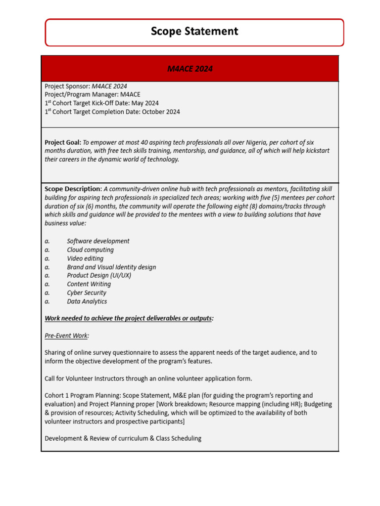 Cohort 1 Program Planning: Scope Statement, M&E plan (for guiding the program’s reporting and