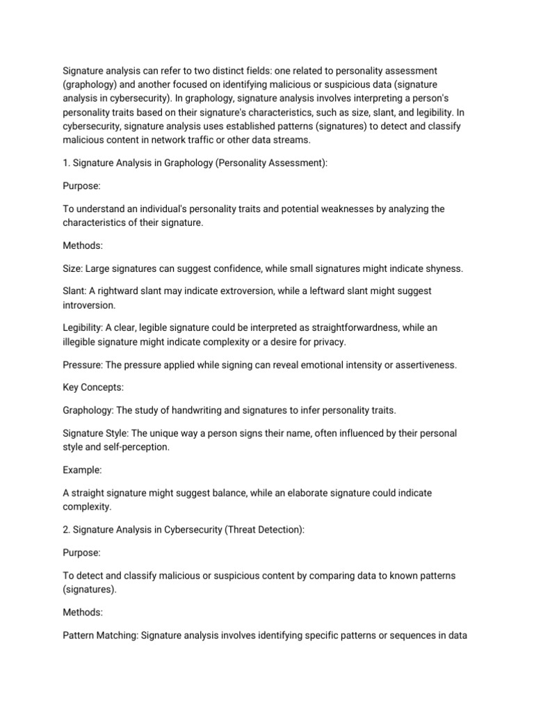 analysis in cybersecurity). In graphology, signature analysis involves interpreting a person's