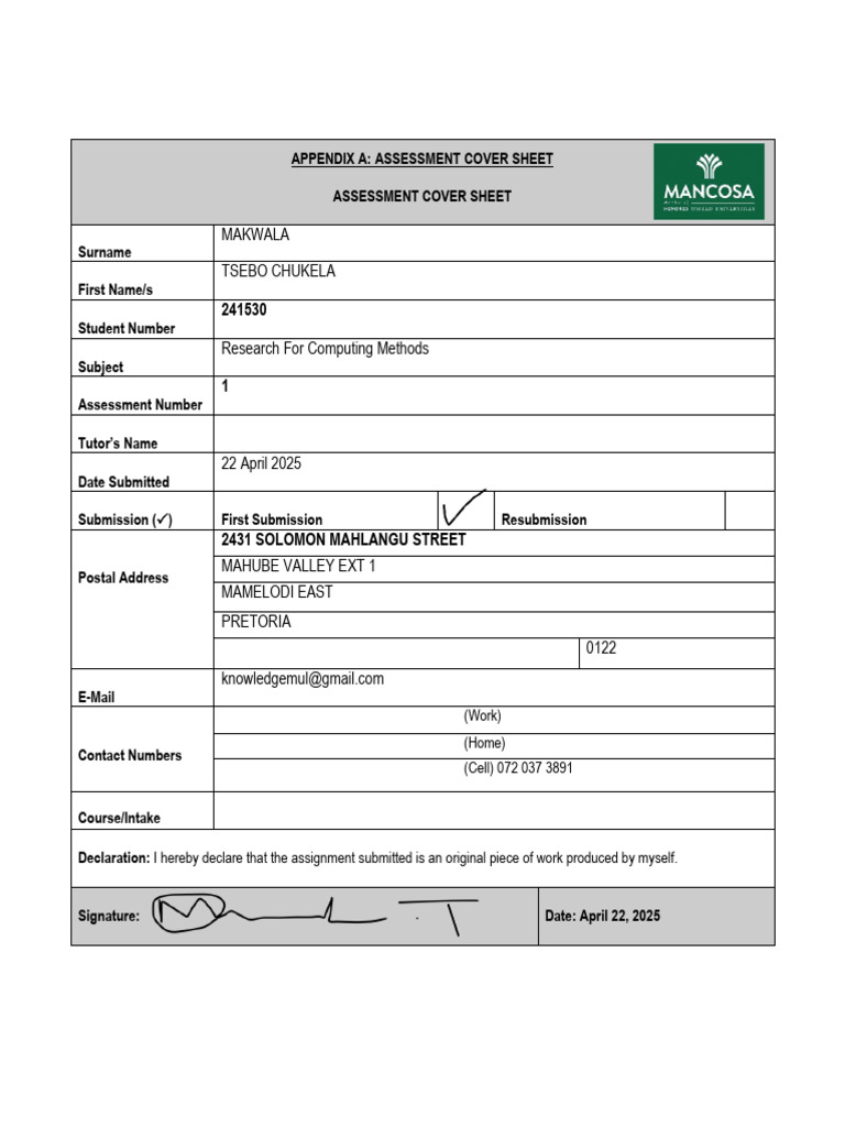 Declaration: I hereby declare that the assignment submitted is an original piece of work produced by myself.