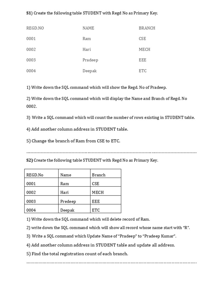 S1) Create the following table STUDENT with Regd No as Primary Key.
