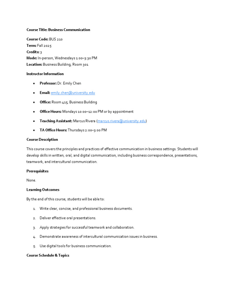 1 Sept 3 Introduction to Business Communication Chapter 1, Syllabus Review