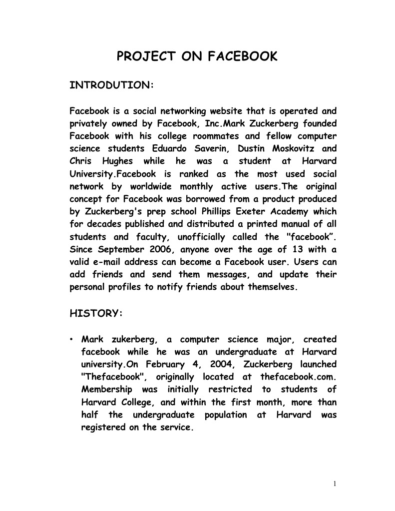 Facebook is a social networking website that is operated and privately owned by Facebook, Inc.Mark Zuckerberg founded Facebook with his college roommates and fellow computer science students Eduardo Saverin, Dustin Moskovitz and Chris Hughes while he was a student at Harvard University.Facebook is ranked as the most used social network by worldwide monthly active users.The original concept for Facebook was borrowed from a product produced by Zuckerberg's prep school Phillips Exeter Academy which for decades published and distributed a printed manual of all students and faculty, unofficially called the "facebook. Since September 2006, anyone over the age of 13 with a valid e-mail address can become a Facebook user. Users can add friends and send them messages, and update their personal profiles to notify friends about themselves.