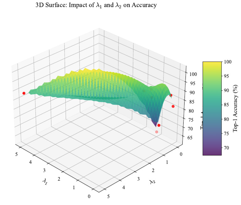 The document presents a 3D surface plot illustrating the impact of parameters λ1 and λ2 on Top-1 accuracy. The accuracy values range from 65% to 100%, indicating varying performance based on different combinations of λ1 and λ2. The plot visually represents how these parameters influence the accuracy metric.