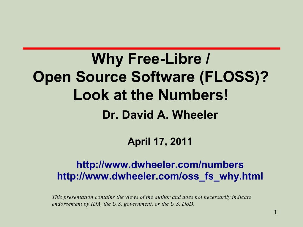 This presentation (C) Copyright 2005-2011 David A. Wheeler. You may distribute unmodified and modified derivative copies; pick from any of these: Creative Commons Attribution-ShareAlike License version 2.5 or greater GNU GPL version 2 or greater GNU Free Documentation License (GFDL) version 1.2 or greater Please include a reference to [Link] and [Link]