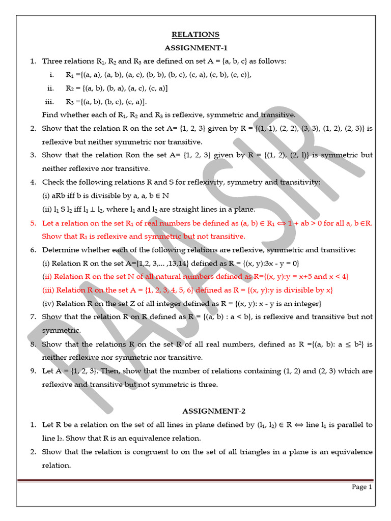 1. Let R be a relation on the set of all lines in plane defined by (l1, l2) ∈ R ⟺ line l1 is parallel to