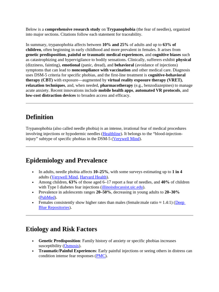 Below is a comprehensive research study on Trypanophobia (the fear of needles), organized