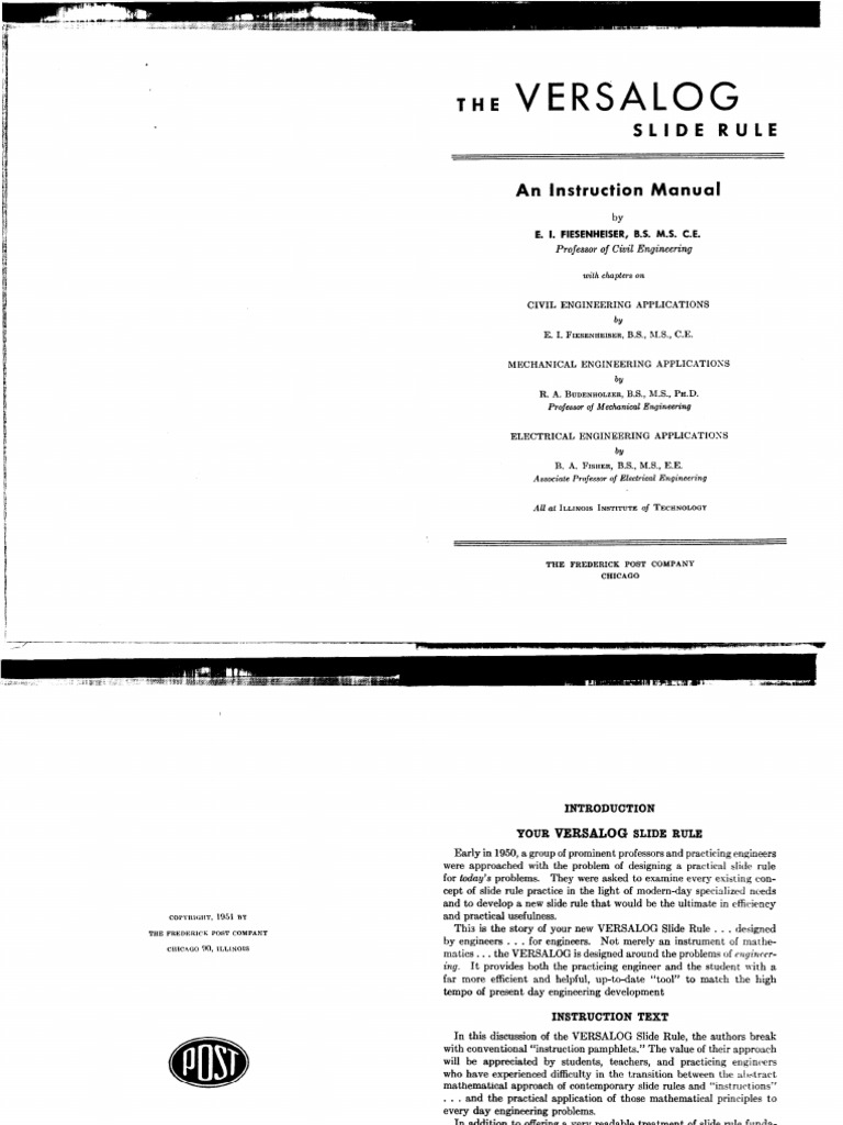 Iirrc.st, most, ac:curat,c slidc rule sold today. reducing the labor of involved calculations. The Post Versalog Slide